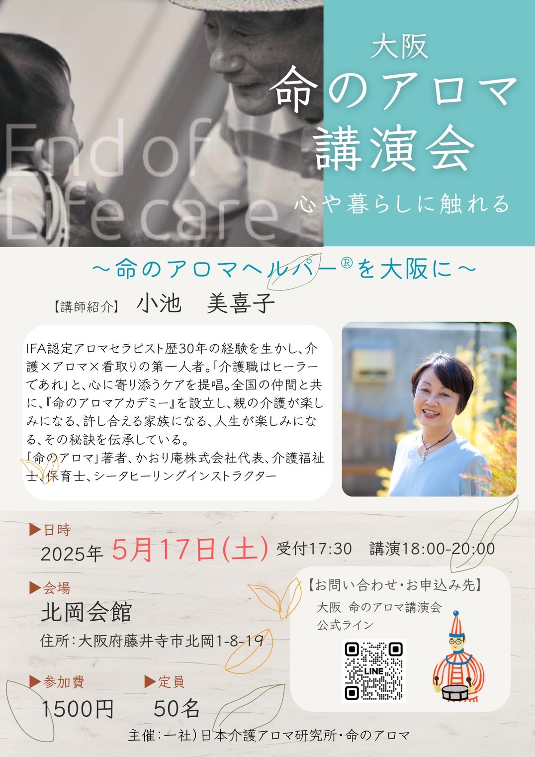 2025年5月17日(土)大阪で講演会開催決定 2025.05.022025.05.07 日程 2025年5月17日(土)講演18:00~20:00(受付17:30) 開催場所 大阪府藤井寺市北岡1丁目8−19 北岡会館 受講料 1,500円 お問い合わせ 大阪命のアロマ講演会LINE
